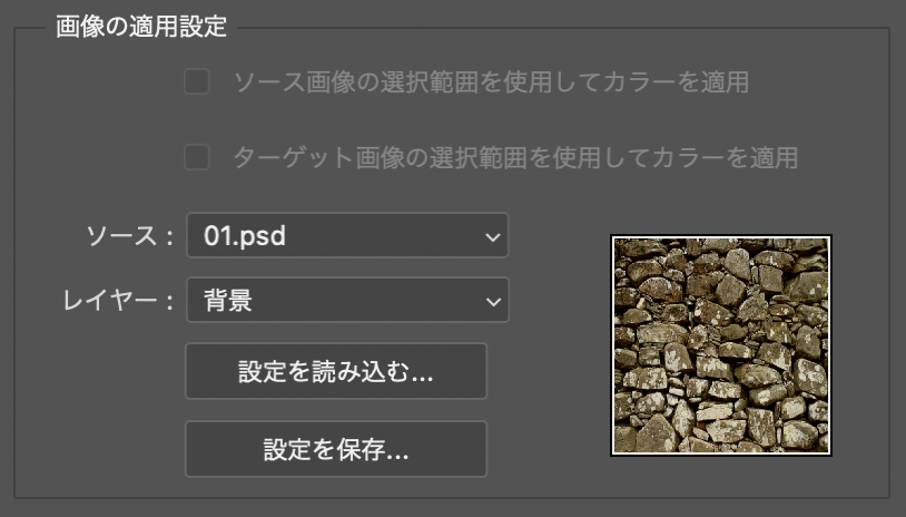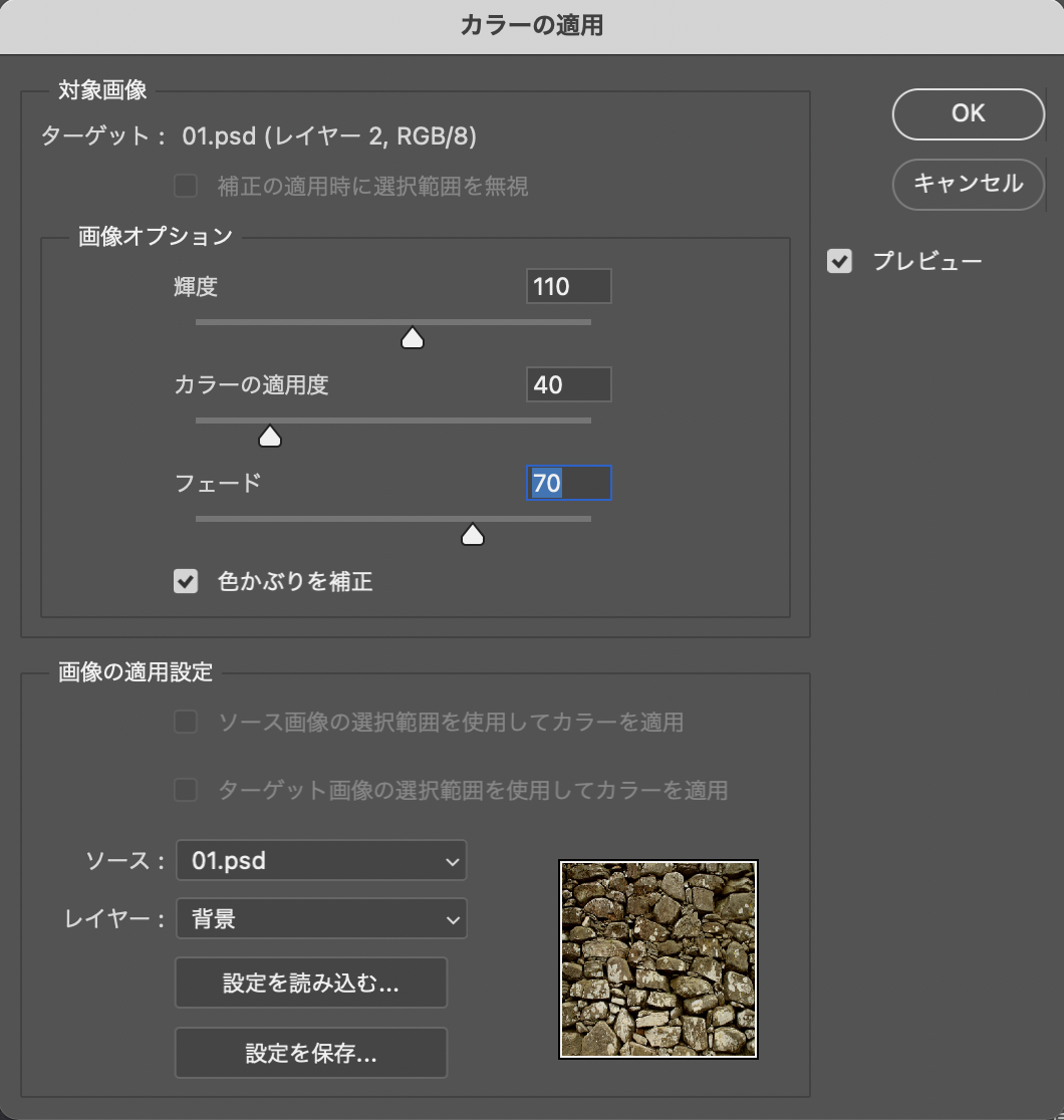 さらになじませるために微調整を施します。レイヤーパネルで被写体のレイヤーを選択したら、イメージメニュー→“色調補正”→“カラーの適用...”を選択し、[画像の適用設定]のソースで背景画像を指定するように設定。ここでは「01.psd」、[レイヤー:背景]に設定(図15)。