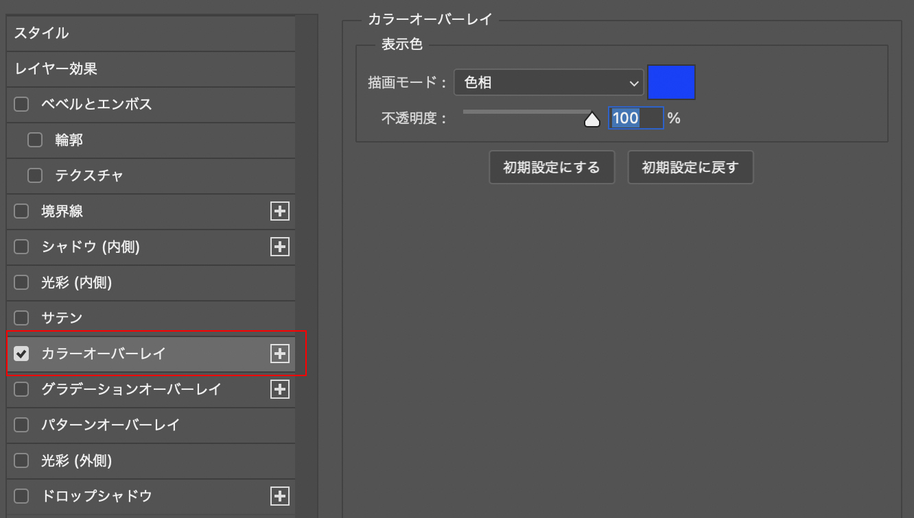続いて、花の色調を調整します。レイヤーパネル上で花のレイヤーをダブルクリックして、レイヤースタイルを開いて、[カラーオーバーレイ]を選択し、[描画モード:色相]、オーバーレイのカラーは青系の色を選択して適用(図20)。もう一枚の花の画像も同様に処理します(図21)。
