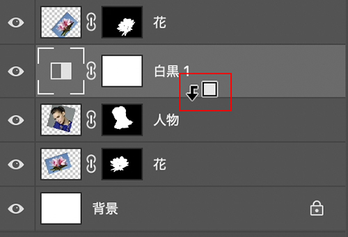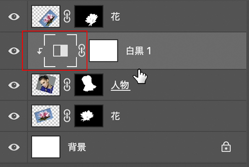 このままだと人物レイヤーより背面(下)のすべてのレイヤーに白黒の効果が適用されてしまうので、レイヤーパネルの調整レイヤーと人物レイヤーの境目にOptionキーを押しながらポインターを合わせて(図16)、クリックします。レイヤーサムネールに下方向のマークが付けばOK(図17)。白黒の効果が人物レイヤーのみに適用されました(図18)。
