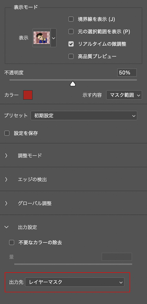 残しておきたい範囲が決まったら、[出力設定]の[出力先:レイヤーマスク]を選択して、OKを押して適用(図8)(図9)。