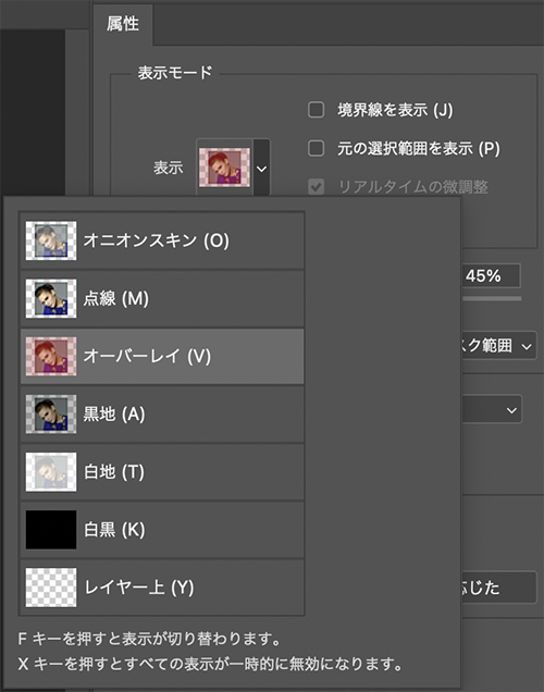 続いて合成しやすいように画像の不要な背景を切り抜きます。選択範囲メニュー→“選択とマスク...”を選択するとワークスペースが開きます。左側のツールはクイック選択ツールを選択し(図5)、表示モードは選択範囲を分かりやすくするために「オーバーレイ」に、[不透明度:50%]程度に設定(図6)。