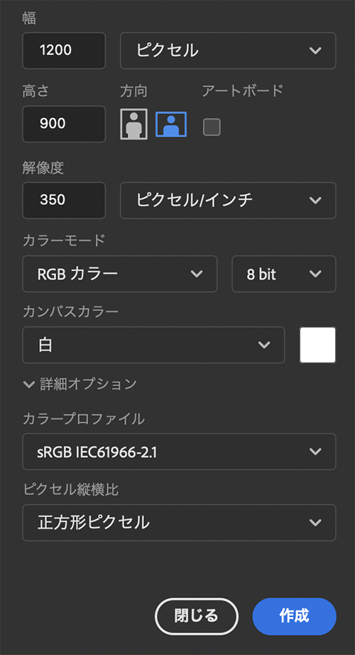人物と花の画像を新規ドキュメント上で合成します。まずはPhotoshopでファイルメニュー→“新規...”で新規ドキュメントを任意のサイズで開きます。ここでは[幅 1200 ピクセル][高さ 900][解像度 350 ピクセル/インチ]のサイズで作成しました(図1)(図2)。