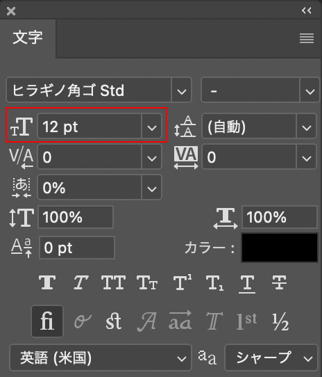 また、ウィンドウメニュー→“文字”で文字パネルを表示すると文字パネル上で文字のサイズを変更できます(図10)。