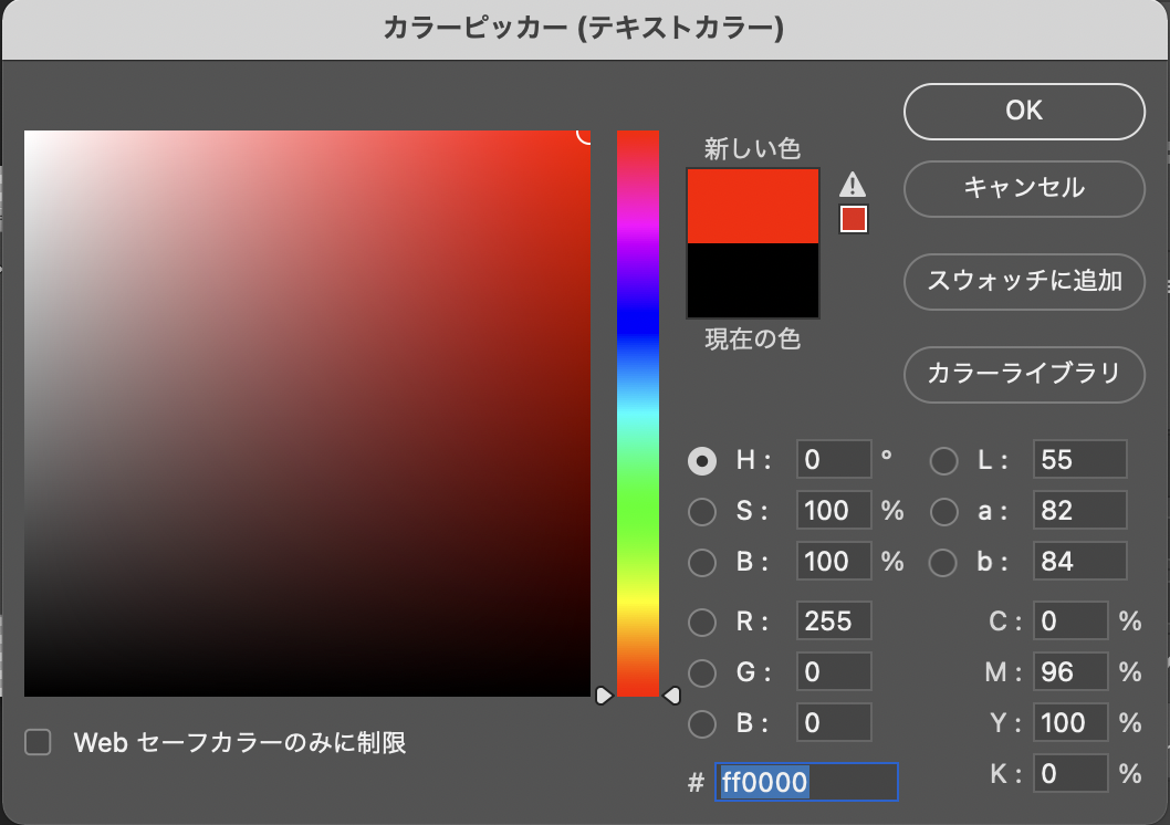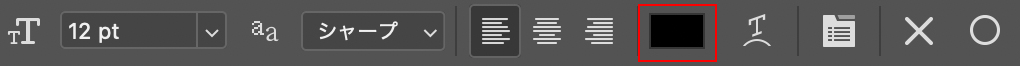 文字(テキスト)入力時に、文字の上をドラッグして選択した状態で(または「◯」ボタンをクリックして入力を確定)、オプションバーのカラーピッカーのアイコンをクリックすると(図13)、文字のカラーを設定することができます(図14)(図15)。