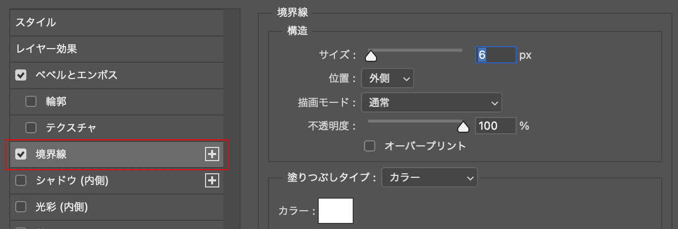 [スタイル:エンボスの境界線を描く]は、レイヤースタイルの[境界線]の効果と組み合わせて、エンボスに境界線を加えて立体的な効果を加えることができます。[スタイル:エンボスの境界線を描く]を選択したら(図9)、左側のメニューから[境界線]をクリックして任意の数値に設定して、文字を立体的にします(図10)(図11)。