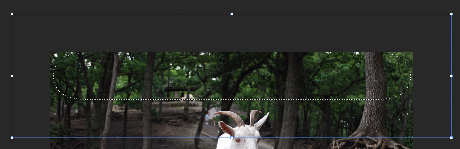 なお、選択範囲メニュー→“選択範囲を変更”→“境界をぼかす...”で[カンバスの境界に効果を適用]にチェックを入れた場合は、カンバスサイズに関係なくのカンバスの外まで境界範囲が適用されて(図5。ここでは、違いが分かりやすいようにバウンディングボックスを表示しています)、チェックを外した場合はカンバスサイズに合わせて選択範囲が自動的に縮小されます(図6)。