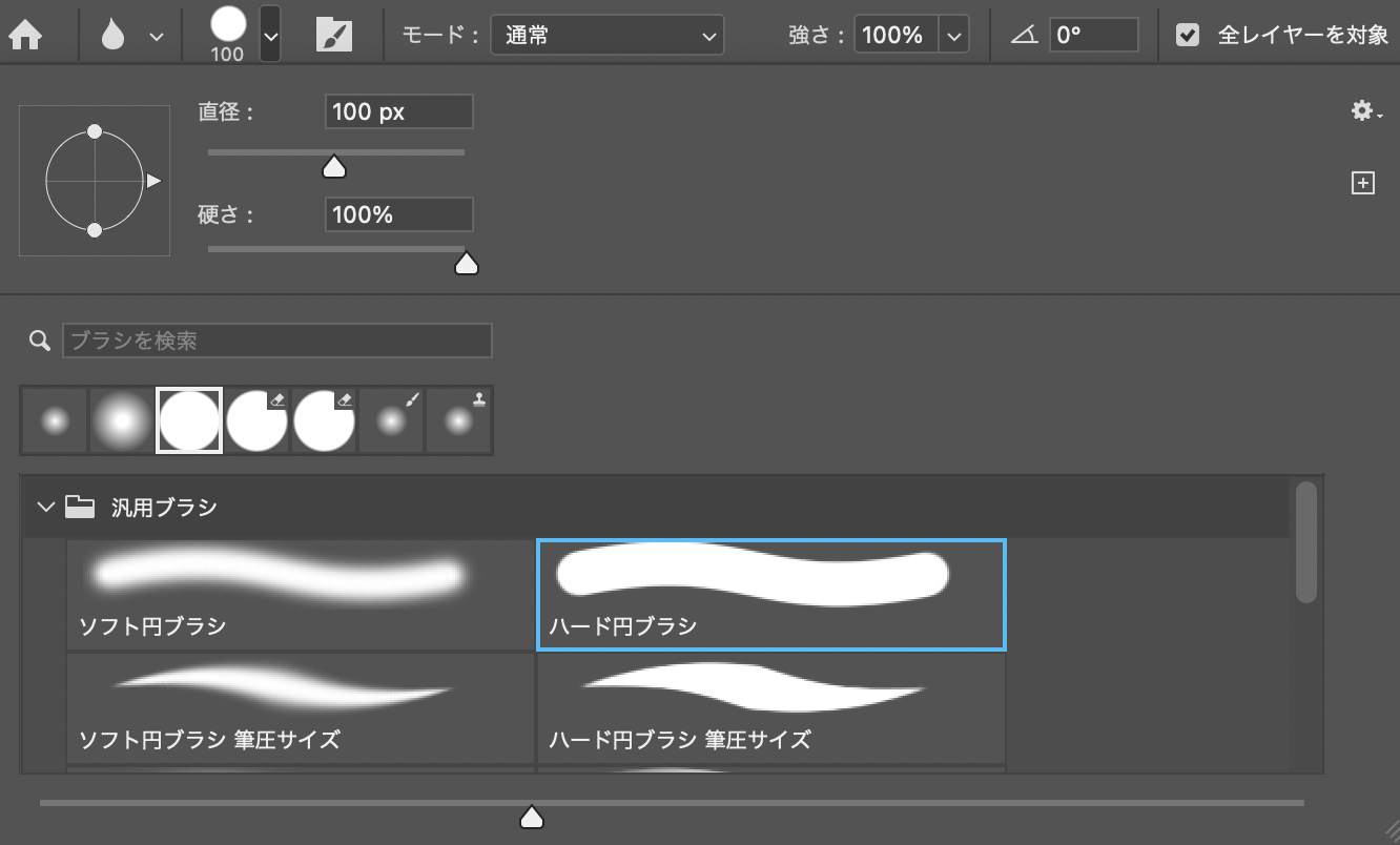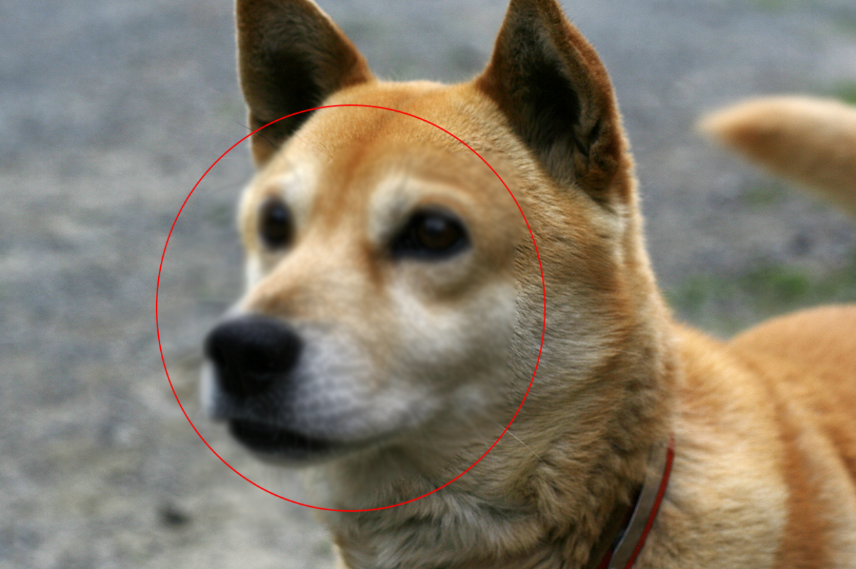 ここでは[ハード円ブラシ][直径:100px]に設定し(図7)、さらにオプションバーの[全レイヤーを対象]にチェックを入れ、ぼかしたい部分をドラッグします(ここでは犬の顔のあたりをドラッグ)。これで画像の一部分だけをぼかすことができました(図8)。
