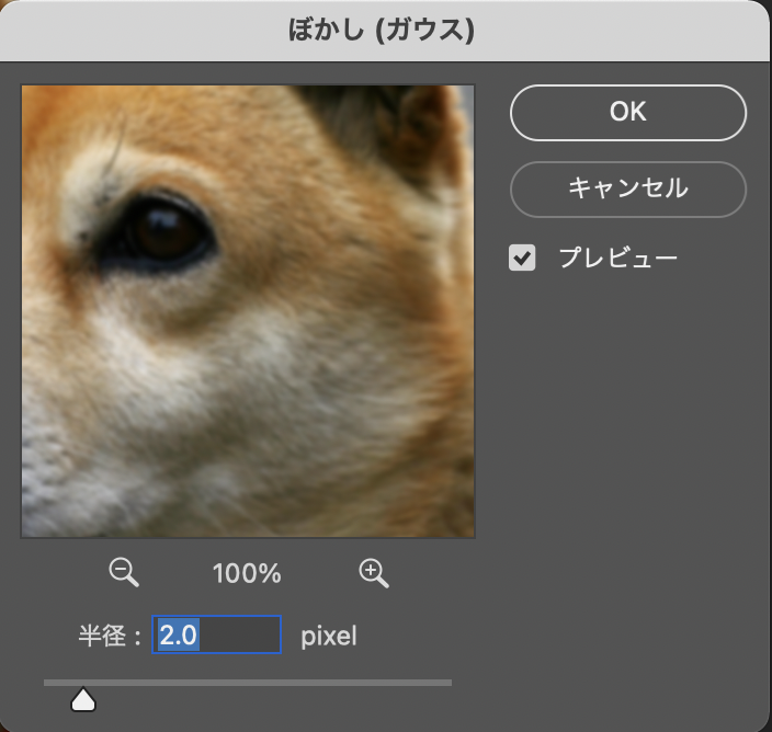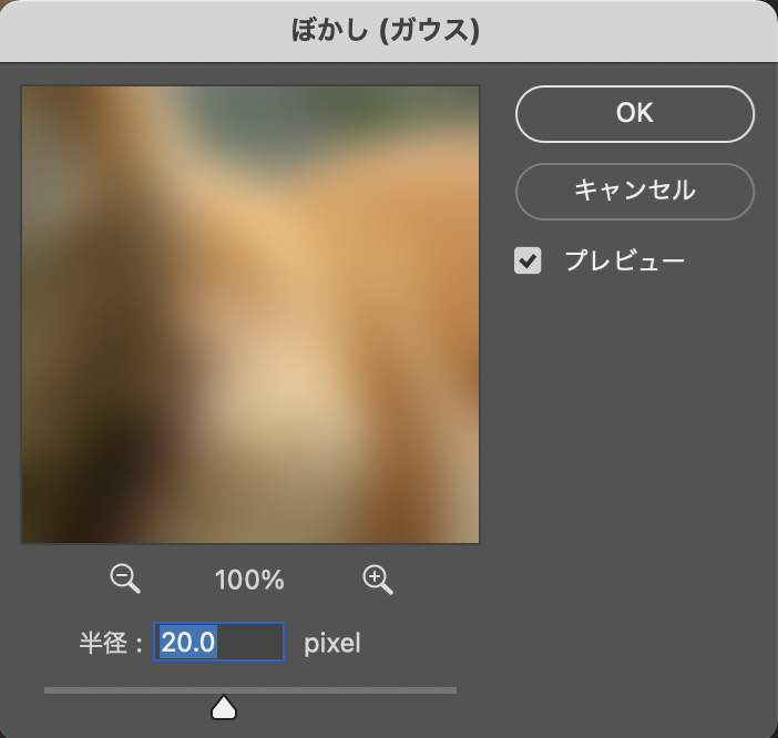 次にフィルターメニュー→“ぼかし”→“ぼかし(ガウス)...”を選択。プレビューにチェックを入れて画面を見ながら、[半径]の数値を設定してぼかしを調整します。数値が低ければぼかしが弱く(図2)(図3)、数値が高ければぼかしが強調されます。(図4)(図5)。