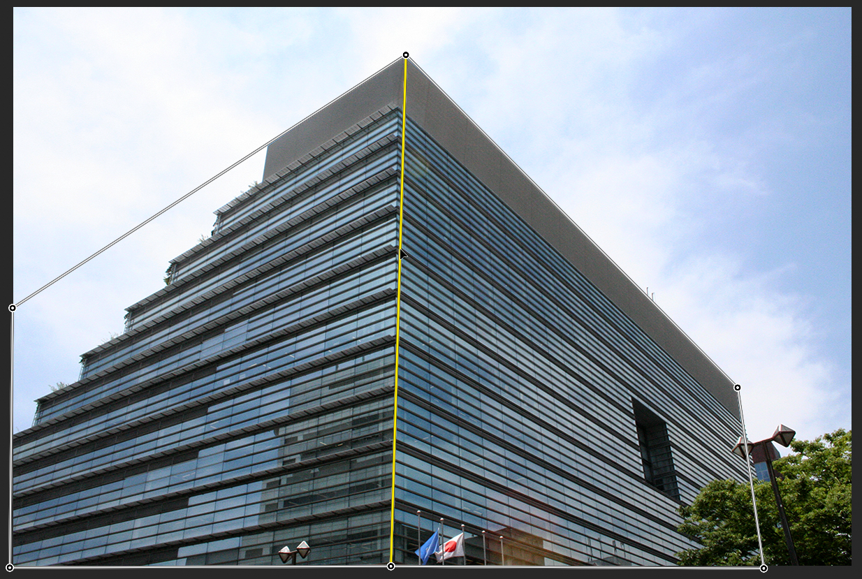 編集メニュー→“遠近法ワープ”を選択し、ドラッグして遠近法ワープを適用する範囲を指定します(図2)。同様にドラッグして適用する範囲を追加します(図3)。