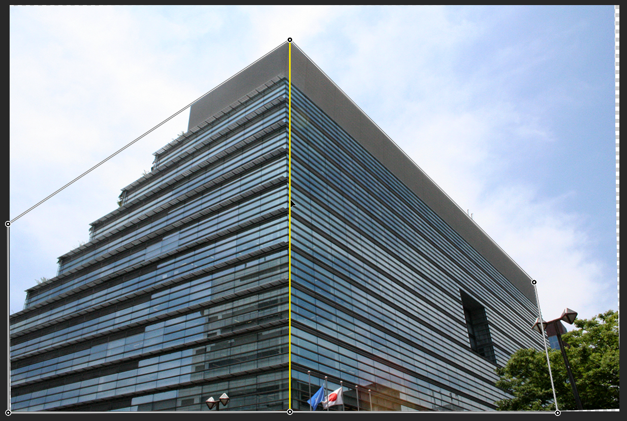 さらにここでは左側の歪みが気になったのでピンを調整(図9)。最後にオプションバーの「◯」ボタンか、Returnキーをクリックすると歪みが補正できました(図10)。