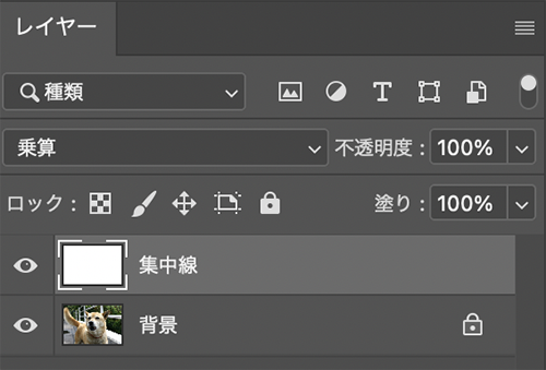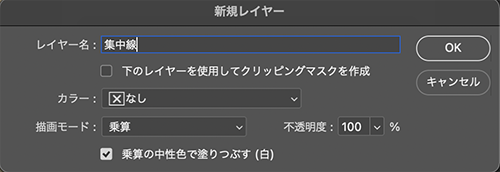 レイヤーメニュー→“新規”→“レイヤー...”を選択し、[レイヤー名:集中線][描画モード:乗算][乗算の中性色で塗りつぶす]にチェックを入れて(図2)、新規レイヤーを作成(図3)。