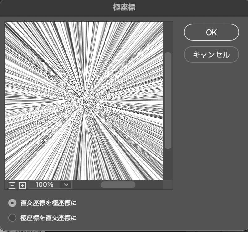 さらにフィルターメニュー→“変形”→“極座標...”を選択して[直交座標を極座標に]を選択してOKで効果を適用(図8)(図9)。これでひとまず集中線は描くことができました。
