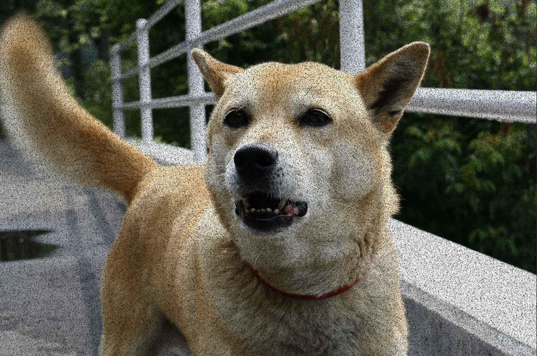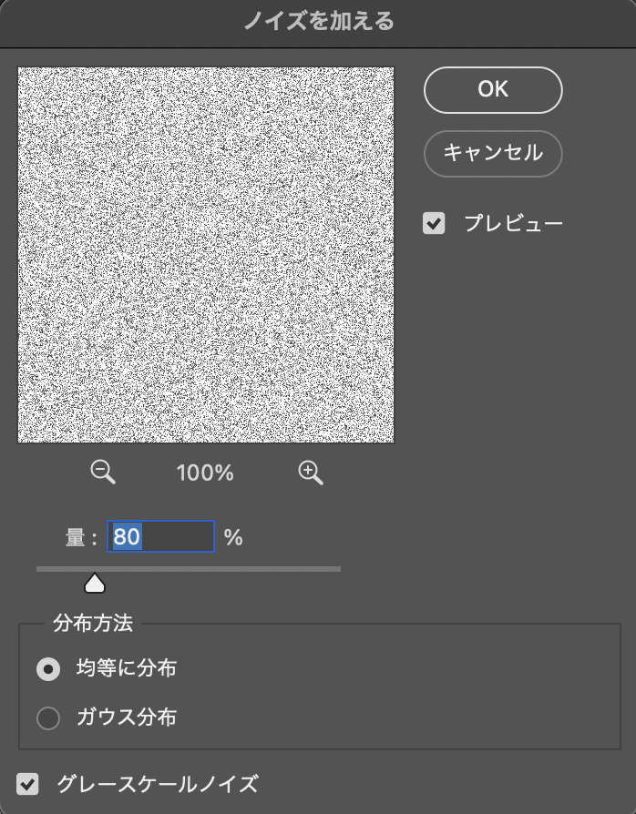 続いてフィルターメニュー→“ノイズ”→“ノイズを加える...”を選択し、[量:80%][均等に分布][グレースケールノイズ]にチェックを入れて(図4)、画像にノイズを加えました(図5)。