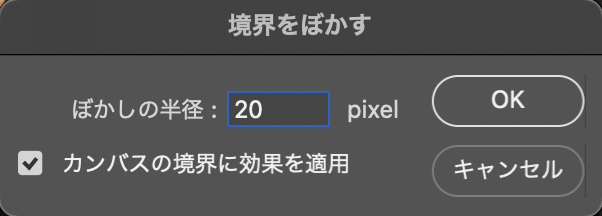 次に選択範囲メニュー→“選択範囲を変更”→“境界線をぼかす...”を選択し、ここでは[ぼかしの半径:20pixel][カンバスの境界に効果を適用]にチェックを入れてOKをクリックして(図12)、さらにDeleteキーを押して選択部分を削除したら完成です(図13)。選択範囲は解除しておきましょ(Command+Dキー)。
