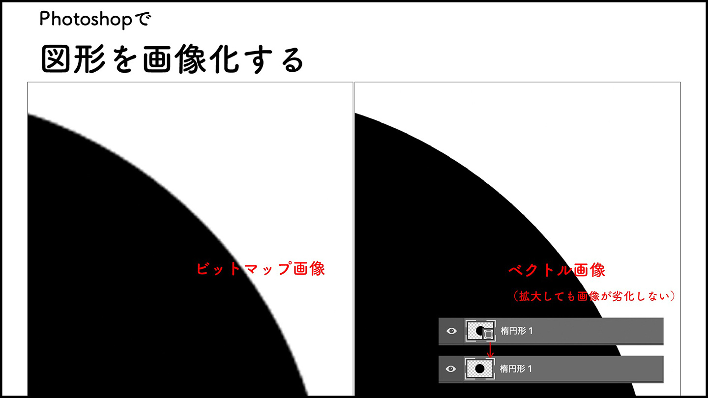 Photoshopにはビットマップ画像とベクトル画像があり、ビットマップ画像はドットが集合して形成された画像で、ベクトル画像は図形や線の情報を数値化して形成された画像のことです。