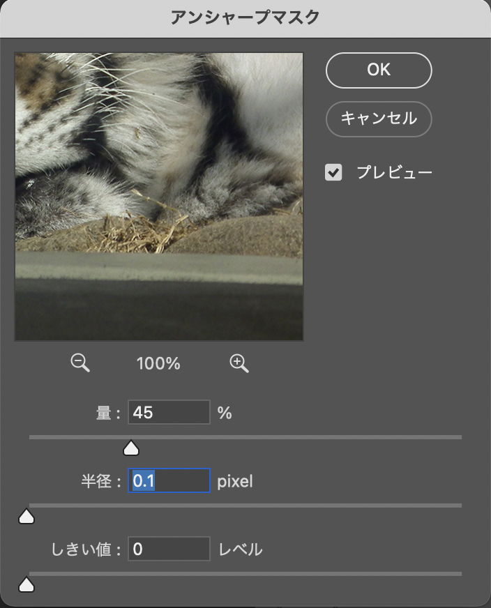 次にフィルターメニュー→“シャープ”→“アンシャープマスク...”を選択し、[プレビュー]にチェックを入れて、数値を設定していきます(図2)。アンシャープマスクはエッジ付近のコントラストを調整して画像をシャープにすることができます。