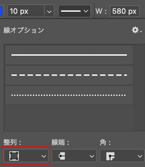 [整列]では(図10)、整列のタイプ(線の外側か、中心か、内側か)の設定が可能です(図11)(図12)(図13)。