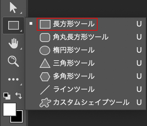 Photoshopで新規ファイルを開いたら、長方形ツールを選択し(図1)、画面をドラッグして四角を作成(図2)。