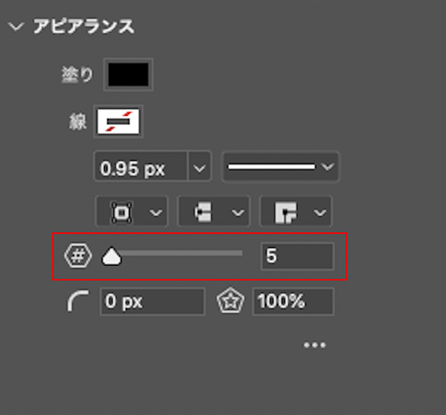 プロパティパネルを開いて[アピアランス]の画数の数値を変えると、三角形や五角形などの多角形が簡単に作成することができます(図19)(図20)(図21)(図22)。