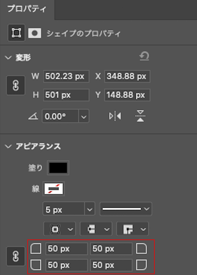 図形を角丸にしたい場合は、プロパティパネルで角丸の半径に数値を入力すると(図13)、入力した値の角丸に変形できます(図14)。