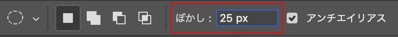 楕円形選択ツールを選択し(図2)、オプションバーの[ぼかし]の数値を入力して選択範囲にぼかしができるように設定します(図3)。