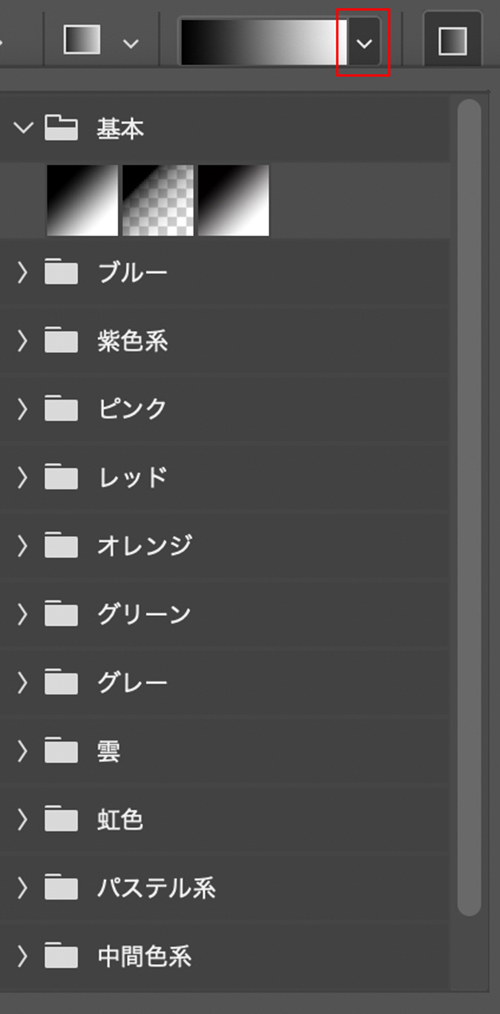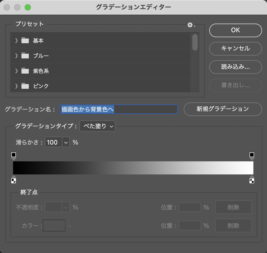 グラデーションバーのプルダウンを開くと、 プリセットのグラデーションタイプを選択できます(図3)。また、グラデーションバーの方をクリックすると(図4)、グラデーションエディターを開いて(図5)、任意のグラデーションのカラーを作成することも可能です。