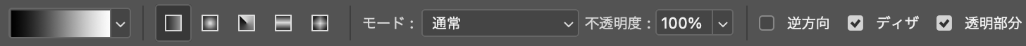そのほか、オプションバーからグラデーションの描画モードの設定や、グラデーションの向きを逆方向に設定するなど、細かい設定も可能なので用途に合わせて設定しましょう。
