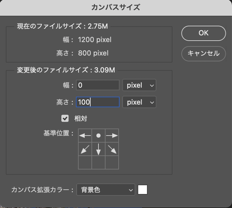 この時、[相対]にチェックを入れると、どの方向にカンバスを追加するか指定できます。ここでは下方向に100px分、カンバスを追加します。[基準位置]のマス目をクリックしてどの方向にカンバスを追加するかの基準位置を設定し、追加したいサイズを入力してOKをクリックすると下方向にカンバスが追加できました(図4)(図5)。