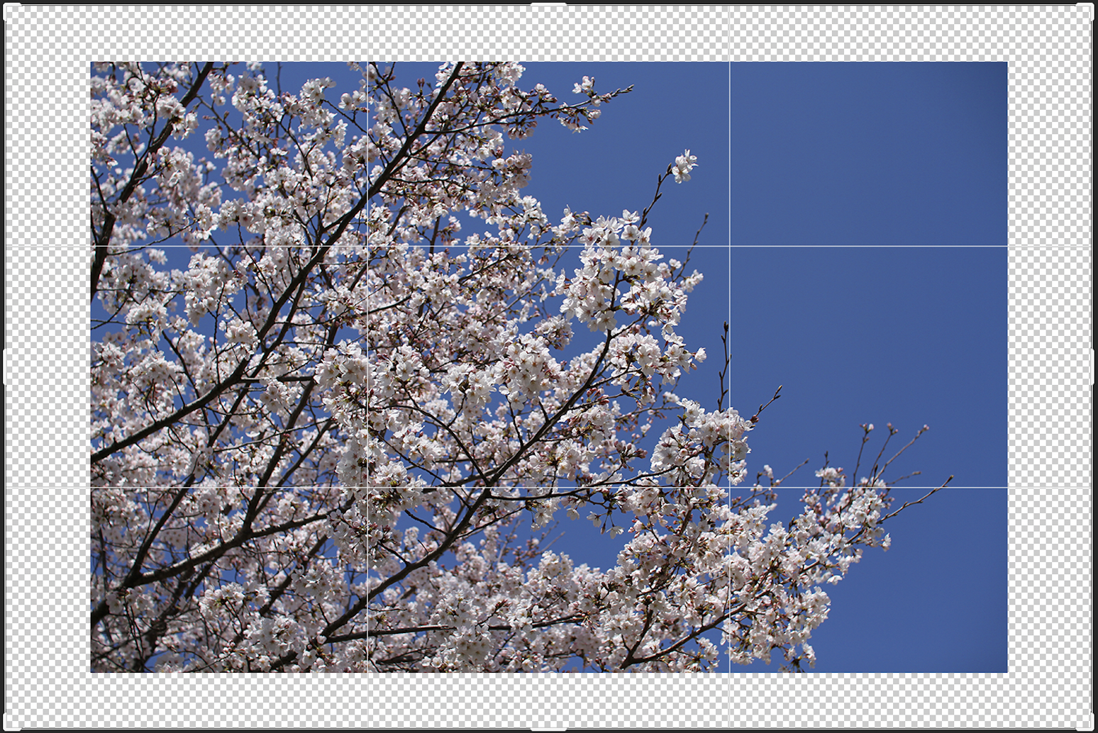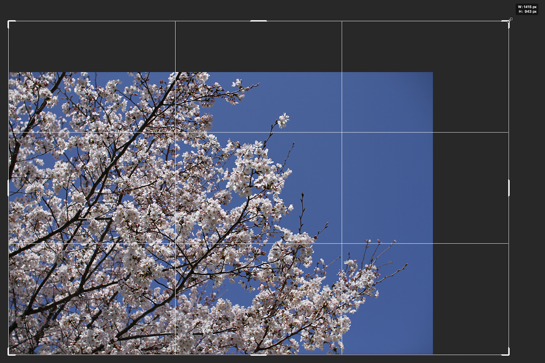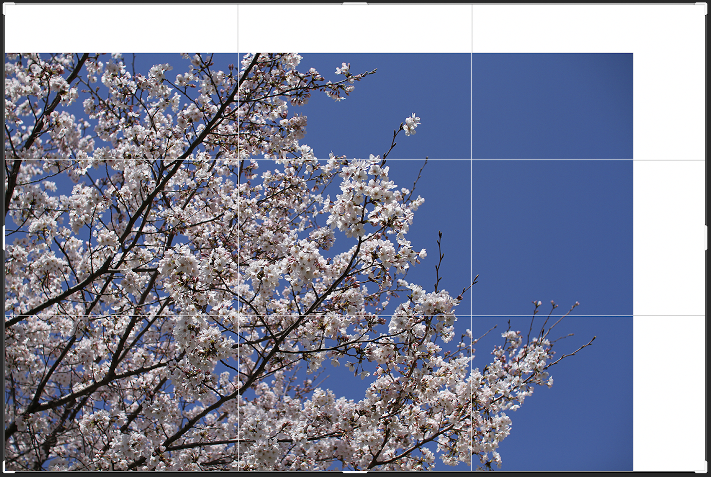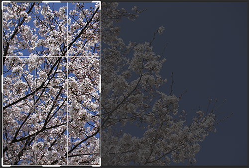 切り抜きツールを使用してカンバスサイズを変更することもできます。切り抜きツールを選択すると(図8)、切り抜きボックスが表示されるので、このボックスをドラックして切り抜きたい形にして(図9)、上部右端の「◯」ボタンもしくはReturnキー(WinはEnterキー)を押せば任意のカンバスサイズに変更できます(図10)。
