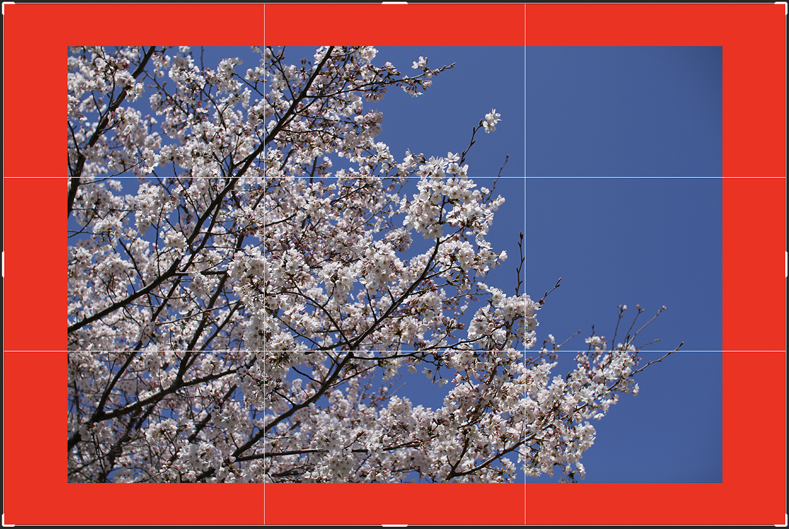 切り抜きツールのオプションバーから[切り抜いたピクセルを削除]にチェックを入れると追加したカンバス部分は背景色で塗りつぶされます。[切り抜いたピクセルを削除]にチェックを入れて、背景色を赤にした場合(図17)。