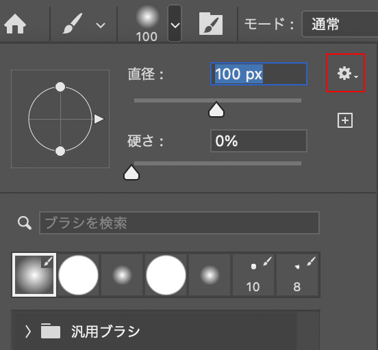 ※レガシーブラシが登録されていない場合は、従来のブライライブラリを呼び出します。ブラシプリセットピッカーの右上の歯車のマークをクリックして(図4)、[レガシーブラシ]を選択し、適用するとブラシが追加されます。
