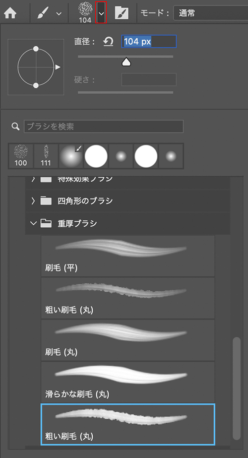 ブラシツールを選択して(図2)、オプションバーのブラシプリセットピッカーからブラシの種類を“レガシーブラシ”→“重厚ブラシ”から[粗い刷毛(丸)]にします(図3)。