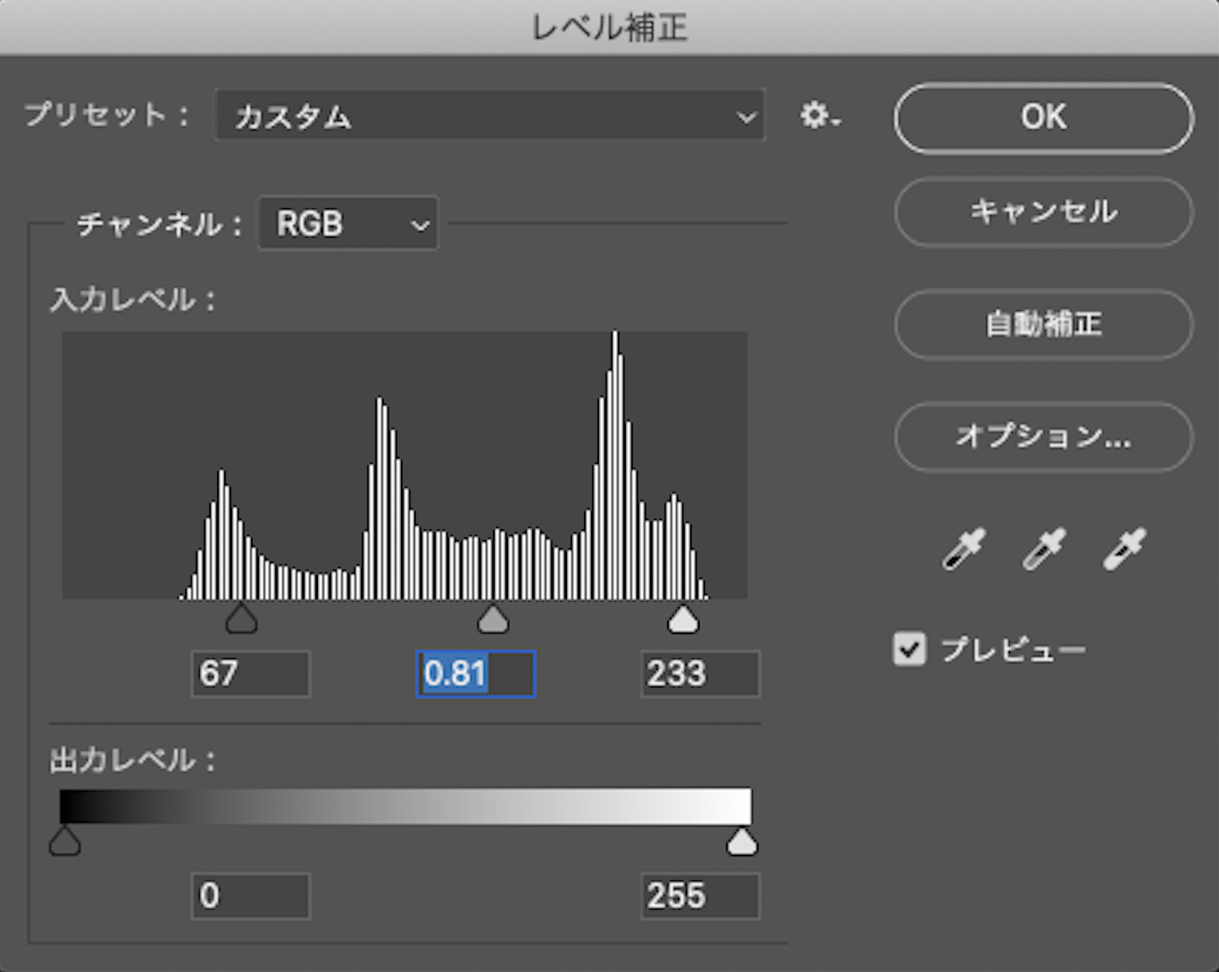 この選択範囲を新規レイヤーにコピー&ペーストし、ペーストしたレイヤーを選択した状態で、イメージメニュー→“色調補正”→“レベル補正...”でコントラストを強調します(図19)(図20)。