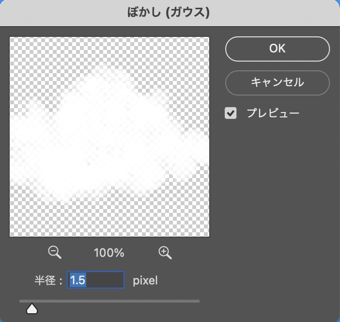 次にフィルターメニュー→“ぼかし”→“ぼかし(ガウス)...”を選択して、[半径:1.5pixel]で適用(図8)(図9)。雲を少しぼかします。