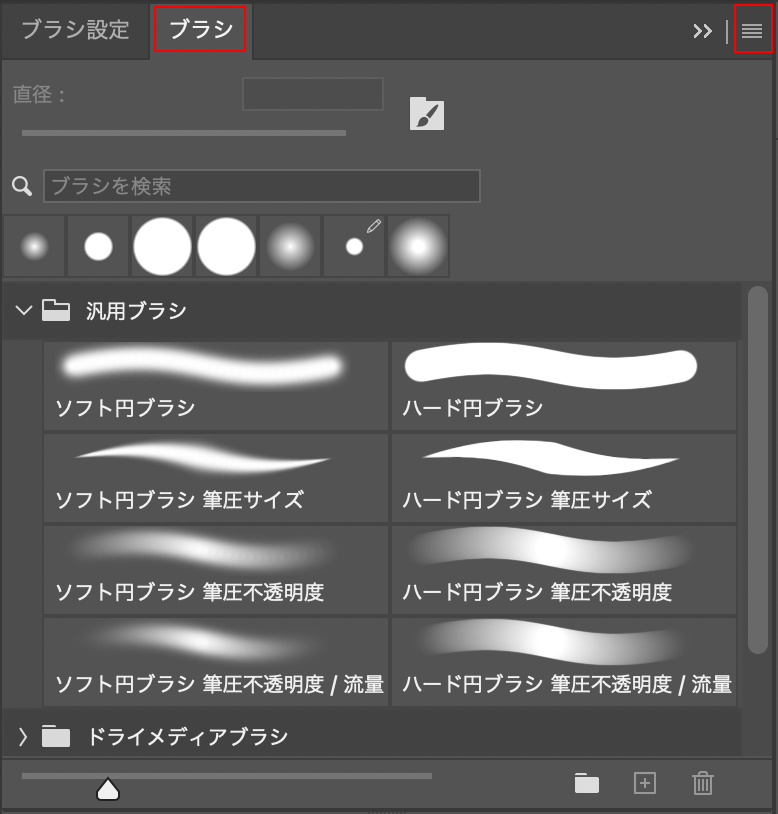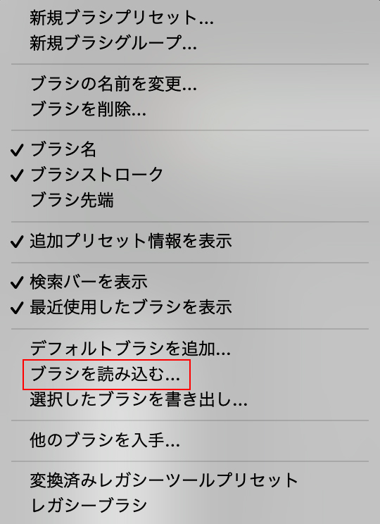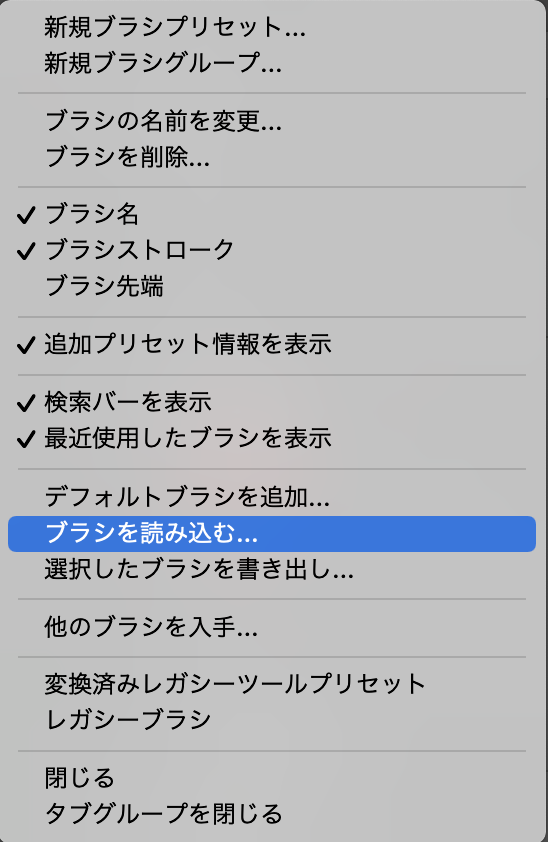 次にタブの[ブラシ]を選択し、右上のメニューアイコンをクリックして(図5)、ブラシを読み込むを選択(図6)。