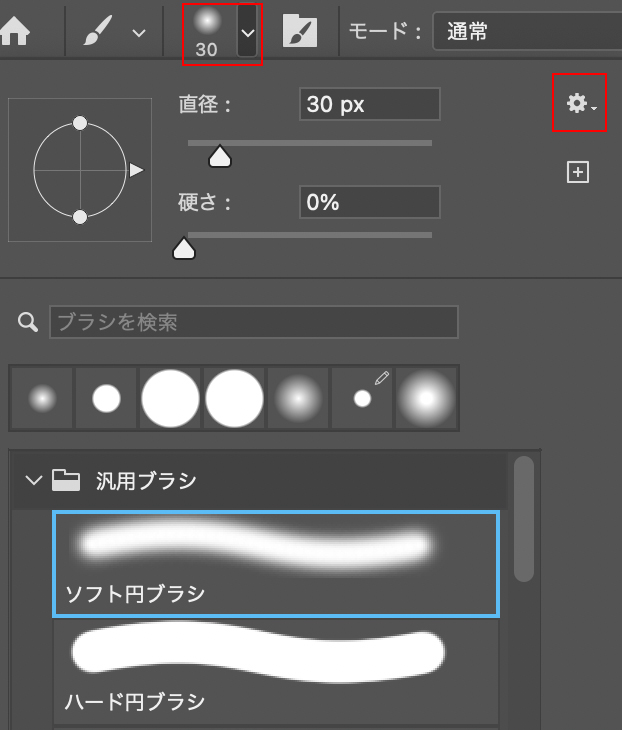 続いてオプションバーのブラシプリセットピッカーを開き、右上の歯車のマークをクリックして(図2)、[ブラシを読み込む...]を選択します(図3)。
