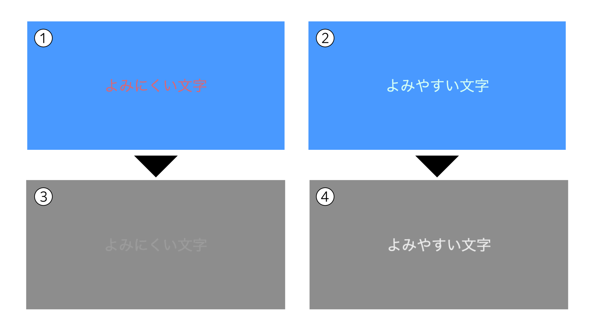 文字やアイコンといった「形」を認識する際、最も頼りにしているのは輝度(明るさ)とコントラストです。どれだけ美しい色を使っても、背景との輝度差がなければ、脳は形を捉えるのに余計なエネルギーを消費してしまいます。色収差(光の波長による焦点のズレ)があることで明るさに差がつくと仮定しても、色が文字の読みやすさに与える影響はあまりないと報告した研究もあります。コントラストチェッカーでNGが出たとき、読みやすくしようと色を選び直すデザイナーも多いでしょう。しかし、実際には明るさ(輝度)が認識の鍵を握っています。この仕組みを意識するだけで、修正の方向性に迷いがなくなるはずです。例えば、図の①は色相が異なる二色ですが、グレースケールに変更すると(図③)、明るさの差がほとんどありません。図②は色自体は似ていますが、明るさの差があるために左よりも読みやすいです(図④)。