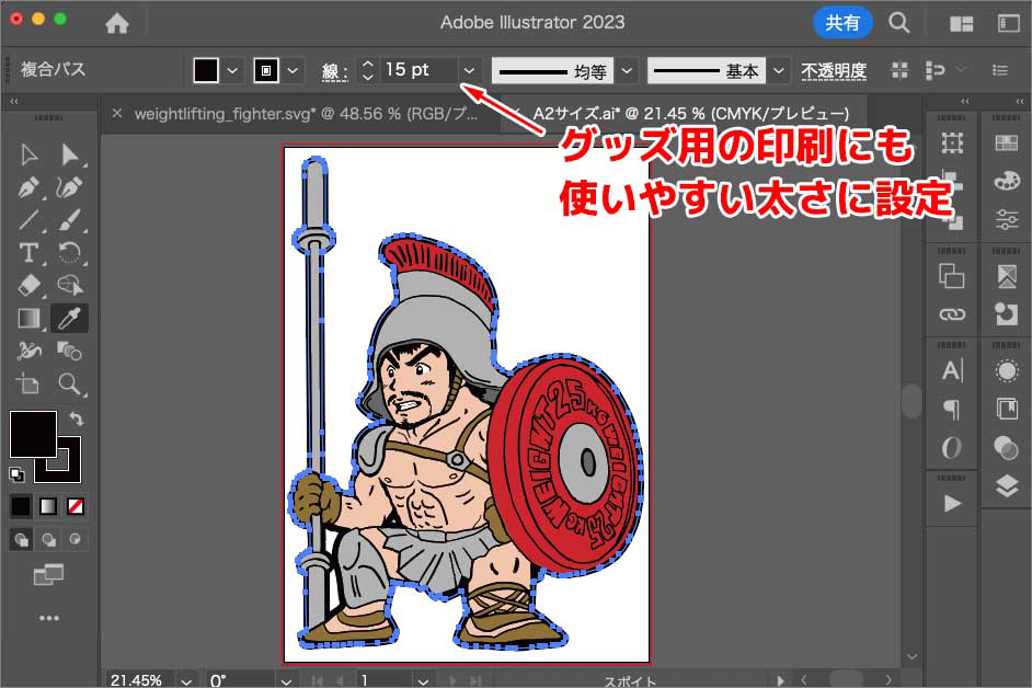 また、輪郭線のパスを選択した状態で、線幅を変更すれば線の太さを簡単に変更できます。グッズなどのプリント用画像は、ある程度線の太さが必要なので、このようにベクター化した後に、線幅を調整できると大変便利です。