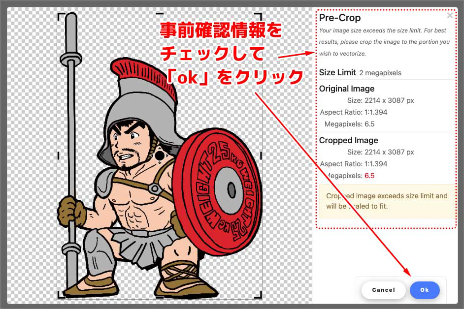 画像をアップロードすると、画像を読み込むのに数秒かかります。読み込みが完了すると左上の画像のように、ベクター化する前の事前確認情報が表示されます。この内容に問題がなかったら右下の「ok」ボタンをクリックするとベクター化が実行されます。