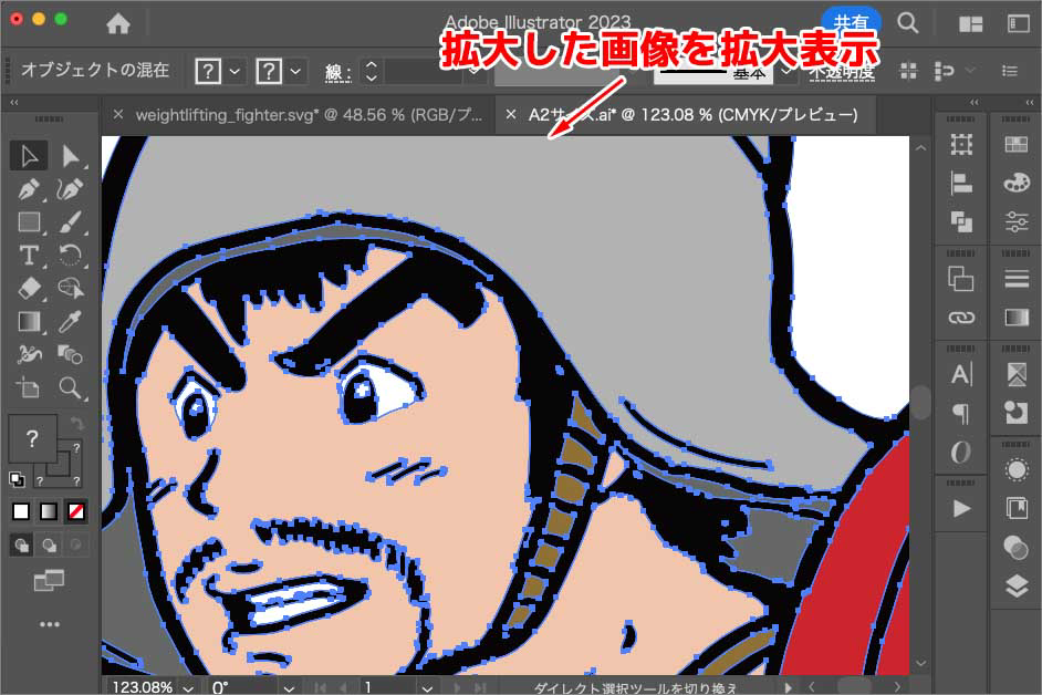A2サイズ目いっぱいにオブジェクトを拡大してみます。拡大した画像を拡大表示すると、なめらかな輪郭線が保たれていることが確認できます。選択ツールでオブジェクトをクリックすると、アンカーポイントも確認できます。