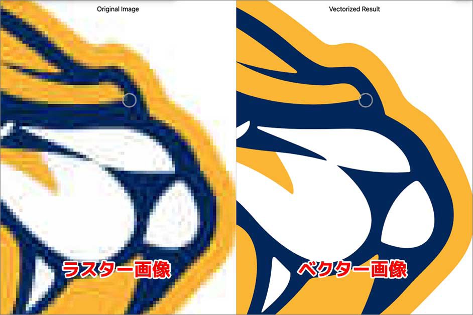オリジナル画像とベクター化された画像を拡大して比較してみましょう。左側がオリジナル画像、右側がベクター化された画像です。オリジナル画像は、ラスター画像なのでドットの集合であるビットマップのシャギーが確認できます。一方でベクター化された画像は、拡大してもなめらかな輪郭を保っています。