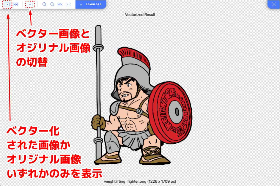 画面右上にあるメニューは、「オリジナル画像とベクター化された画像のいずれかのみ表示させる」ボタン、「前述のオリジナル画像とベクター化された画像を比較表示させる」ボタン、「オリジナル画像とベクター化された画像を切り替える」ボタン、「拡大・縮小」ボタン、「全体表示・実サイズ表示」ボタン、「ダウンロード」ボタンがあります。