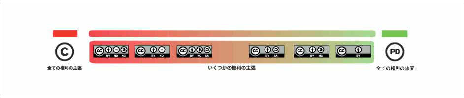 以下の図のように、全ての権利を主張した「著作権のある状態」から、全ての権利を放棄した「パブリックドメイン」の間に、上記の基本要素を組み合わせることで構成されたいくつかの権利の主張を含む「6種類のライセンス」が存在します。