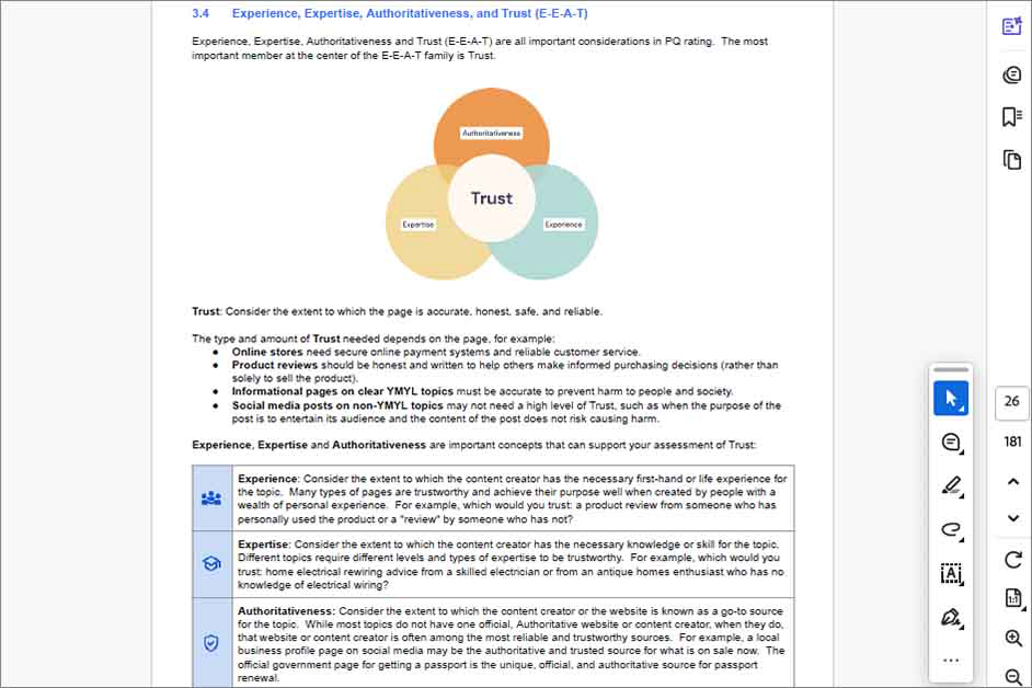 | Trustworthiness(信頼性) | コンテンツ、コンテンツ作成者、Webサイト全体が信頼できるものであるか |