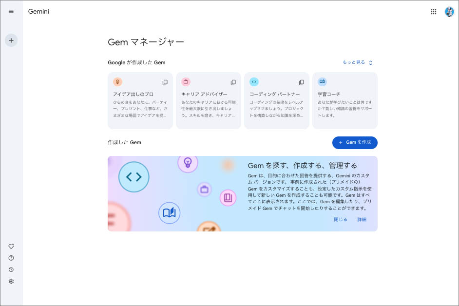 | Gems | 特定のタスクや目的に合わせてカスタマイズ可能なAIエキスパートを作成するGeminiの機能。繰り返しの指示なしに、より専門的で効率的な対話が可能となる |
