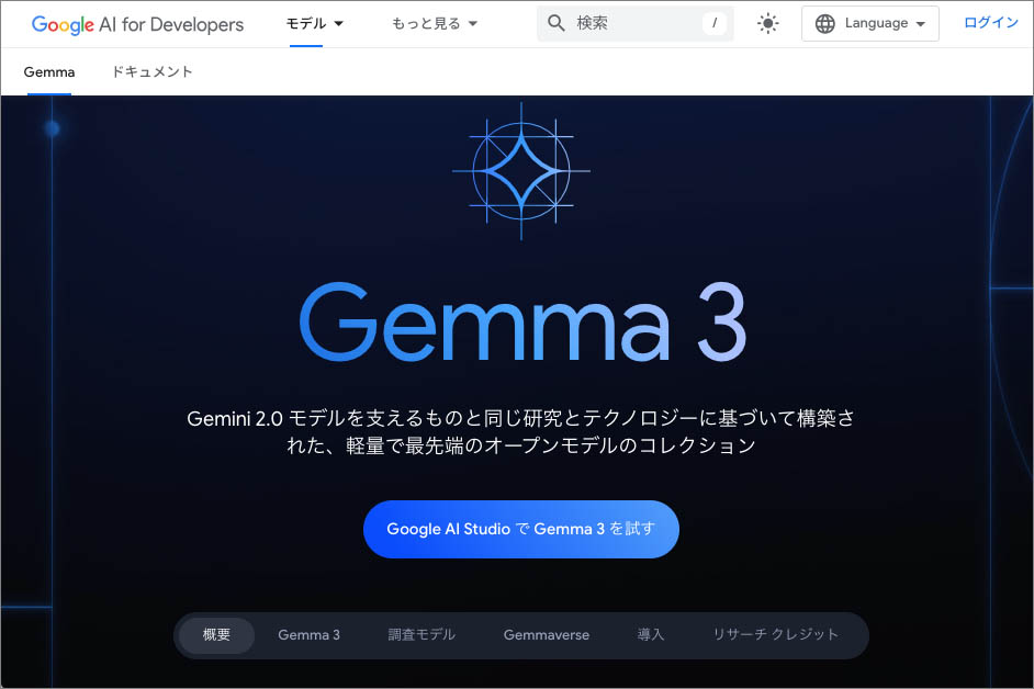 | Gemma 3 | 最新の高性能モデルファミリー。非常に長いコンテキストウィンドウ、優れた多言語対応、関数呼び出し、マルチモーダル(テキスト+画像)対応などが特徴。多様なサイズ展開で、幅広いニーズに対応 |
