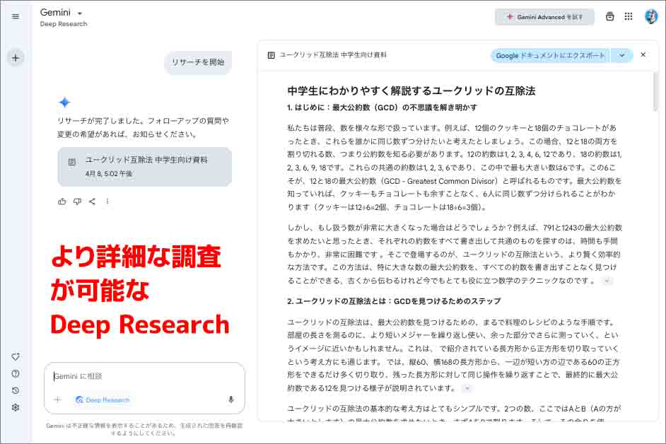| Deep Research | 無料版のGeminiでも利用可能な高度な検索・分析機能(速度や利用状況に制限がある可能性あり) |
