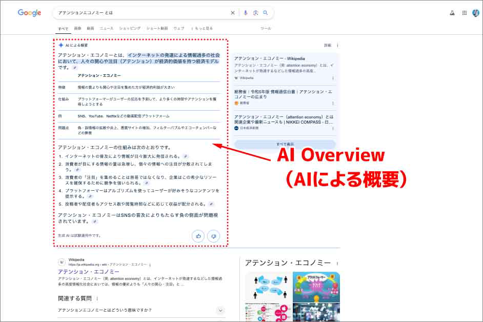| AI Overview | ユーザーの検索クエリに対応して情報を要約する生成AI機能。検索結果の上部に概要として表示される。Googleのシステムが、生成AIによる概要が特に役立つと判断した検索クエリに対して自動的に表示される |