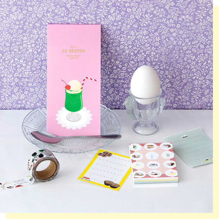 本物のサブレみたいなカード、オムライスのアートワークが食欲をそそる粘葉本、甘い香りのインク、パーラーにいるみたいなときめきで満たされる文房具。