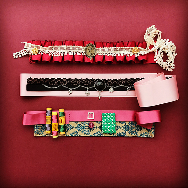 木野 オカダヤかユザワヤ、手芸に特化した通販サイトなどで、海外から輸入しているものなどをチェックしています。出会いがあればという感じで。これは(画像参照)一度に3本作ろうと思い、準備段階を撮りました。いちばん上は、サテンのリボンでひだを作って縫い終わったところ。レジン樹脂で固めてブローチっぽくしようかなと思っています。この3つはマリー・アントワネット調、ロココ調に仕上げる予定です。